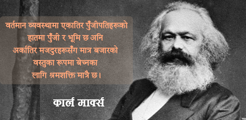 मार्क्स : वर्तमान व्यवस्थामा एकातिर पुँजीपतिहरूको हातमा पुँजी र भूमि छ अनि अर्कातिर मजदुरहरूसँग एउटा बजारको वस्तुका रूपमा बेच्नका लागि श्रमशक्ति मात्रै छ ।